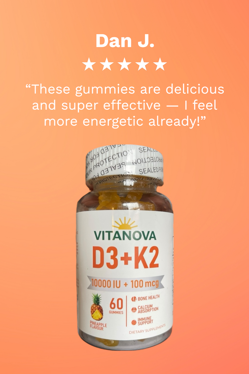 Give your body the sunshine it deserves with VitaNova D3+K2 Gummies — a tasty, tropical boost of vitality.